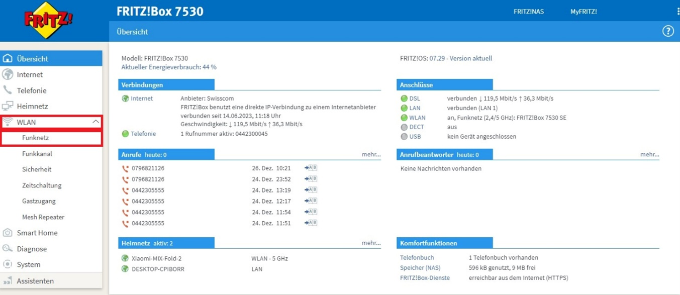 8. Wählen Sie in der Übersicht links den Punkt „WLAN“ und anschliessend „Funknetz“.