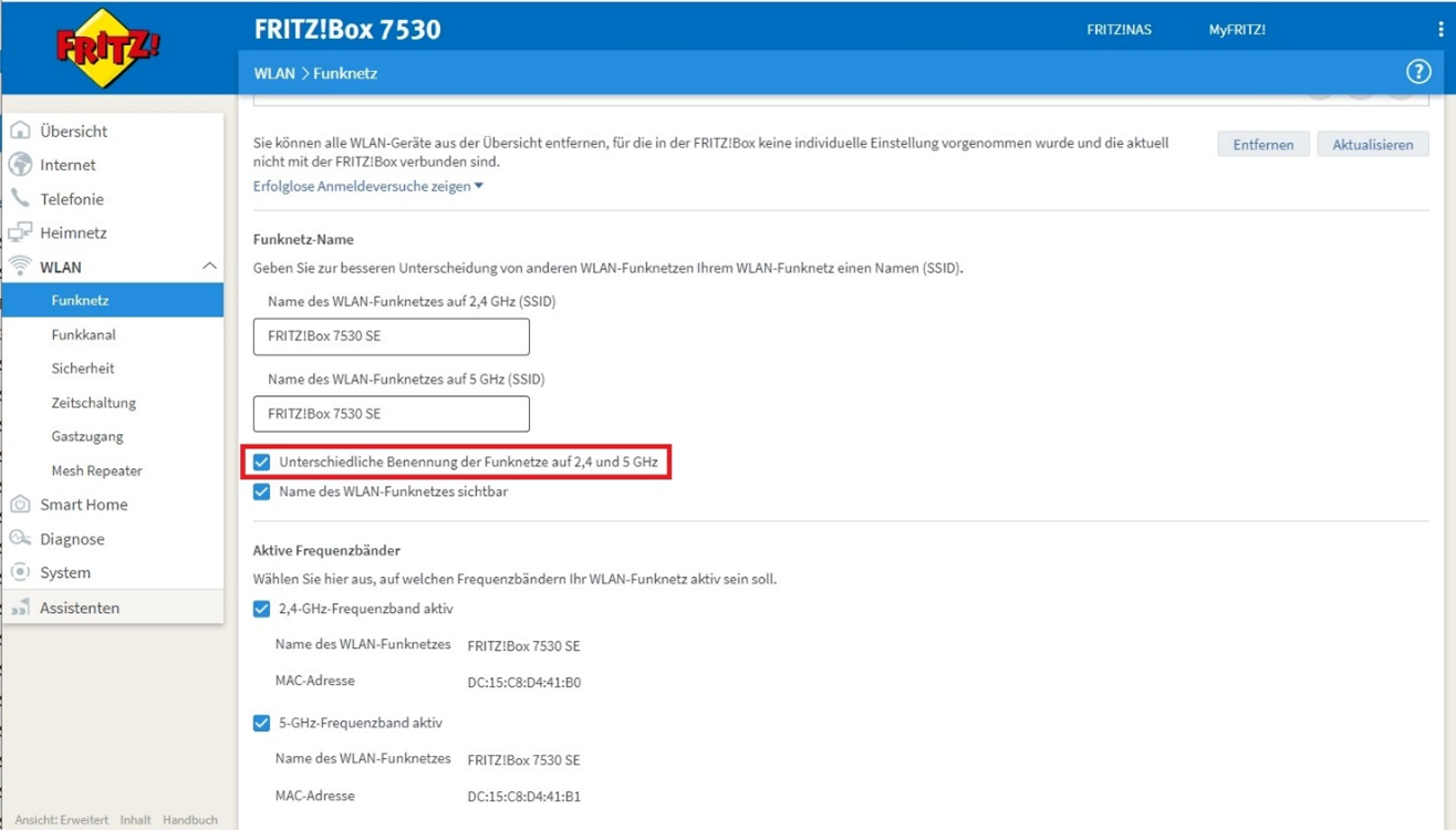9. Scrollen Sie nach unten, bis Sie „Unterschiedliche Benennung der Funknetze auf 2,4 und 5 GHz“ sehen. Wählen sie dieses Kästchen an und benennen Sie dementsprechend auch die Netzwerke.