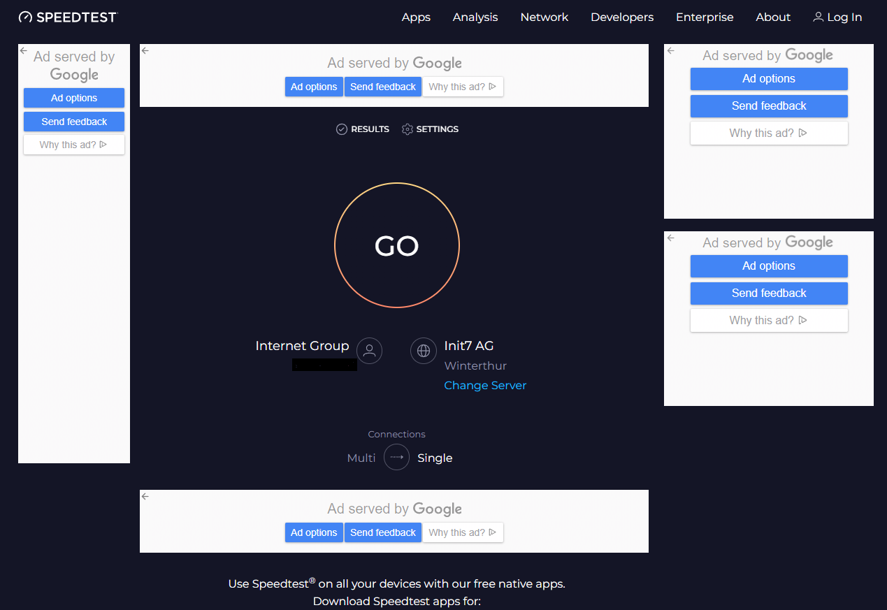 1. Verwenden Sie einen Speedtest.net Testserver mit mindestens 10 Gbit/s Anbindung (z.B. Winterthur -> init7), wir prüfen einen solchen zukünftig selbst zu betreiben.